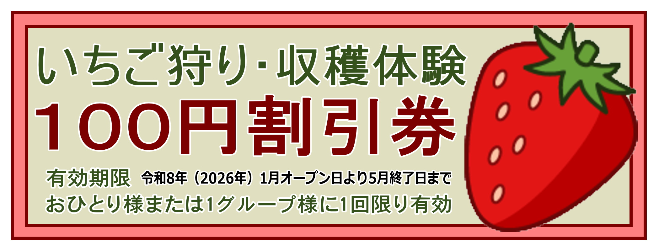 こちらは、当農園にて『いちご狩り』をご利用されるお客様のみにクーポン(1回限り)としてご利用ができます。
